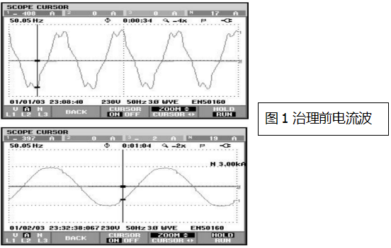 陜西某著名風(fēng)景區(qū)附近的星級(jí)酒店, 在未使用有源濾波器時(shí),總進(jìn)線開關(guān)無(wú)故跳閘,嚴(yán)重影響到酒店的經(jīng)濟(jì)效益。經(jīng)分析,該項(xiàng)目配電系統(tǒng)負(fù)載主要為節(jié)能燈、空調(diào)、水泵等設(shè)備,并存在三相不平衡的情況。同時(shí),電網(wǎng)中存在大量的諧波電流污染,主要以 3,5,7次為主,N 相電流極大,諧波含量大,三相不平衡嚴(yán)重(負(fù)序電流大) ,導(dǎo)致該變壓器下其他設(shè)備不能正常工作,同時(shí),變壓器發(fā)熱量大。之后采用有源濾波器集中補(bǔ)償諧波電流,共 6臺(tái)變壓器,每臺(tái)變壓器采用 150 A 有源濾波器。使用我司生產(chǎn)研制的型號(hào)ZD-AMS有源濾波器后,電流波形矯正明顯由極不平衡的狀態(tài)治理成了極為平滑的正弦波, 諧波電流有效值在超出濾波器容量范圍的情況下, 有源濾波器的補(bǔ)償率達(dá)到了90%以上,三相不平衡現(xiàn)象有所改善,有效解決了總進(jìn)線開關(guān)無(wú)故跳閘的問題,具體情況如圖 1所示。