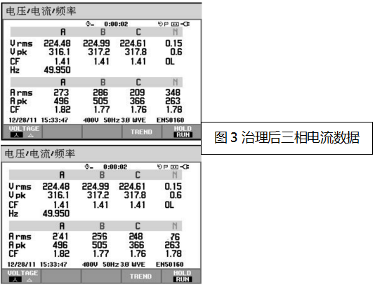 原有三相不平衡 A/B/C 最大不平衡電流為 30 A,治理后,三相不平衡現(xiàn)象基本消除